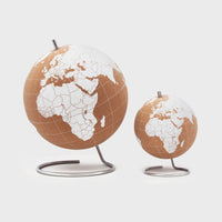 Our classic Cork Globe with a new white print. Stick pins in the places you’ve been or plan your future travels. Mounted on a stainless steel base and supplied with a set of red pins, our unique globe is available in large 10" (Ø 25cm) and mini 5.5" (Ø 14cm). The perfect gift for adventurous friends.