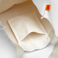 Natural cotton tote bags with something going on inside. Each bag features a cute plush animal poking its head through a rough, frayed hole, like it’s stowed away for the day and enjoying the view. Functions like a tote / Feels like a companion / Explains nothing.