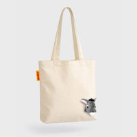 Natural cotton tote bags with something going on inside. Each bag features a cute plush animal poking its head through a rough, frayed hole, like it’s stowed away for the day and enjoying the view. Functions like a tote / Feels like a companion / Explains nothing. -