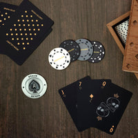 Deluxe wooden presentation box with playing cards, 100 custom poker chips and metal dealer chip.